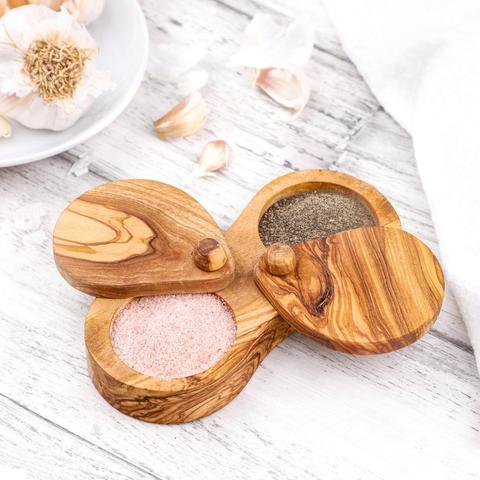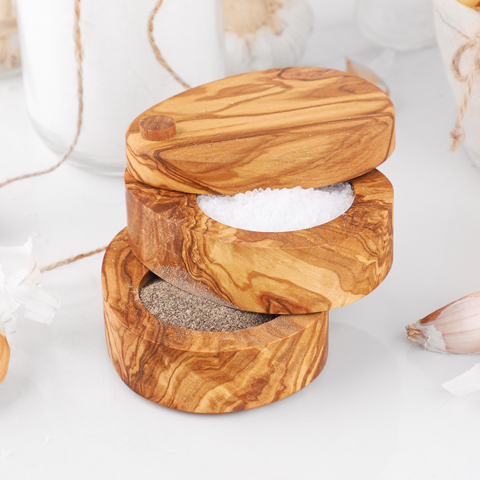 Salero de madera de olivo doble capa con tapa pivotante